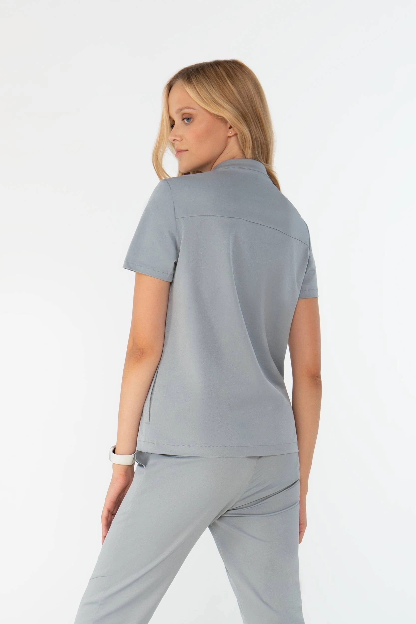 - A refined women’s medical top that combines modern elegance with functionality, featuring a fitted silhouette, stand-up collar, and practical side pockets.